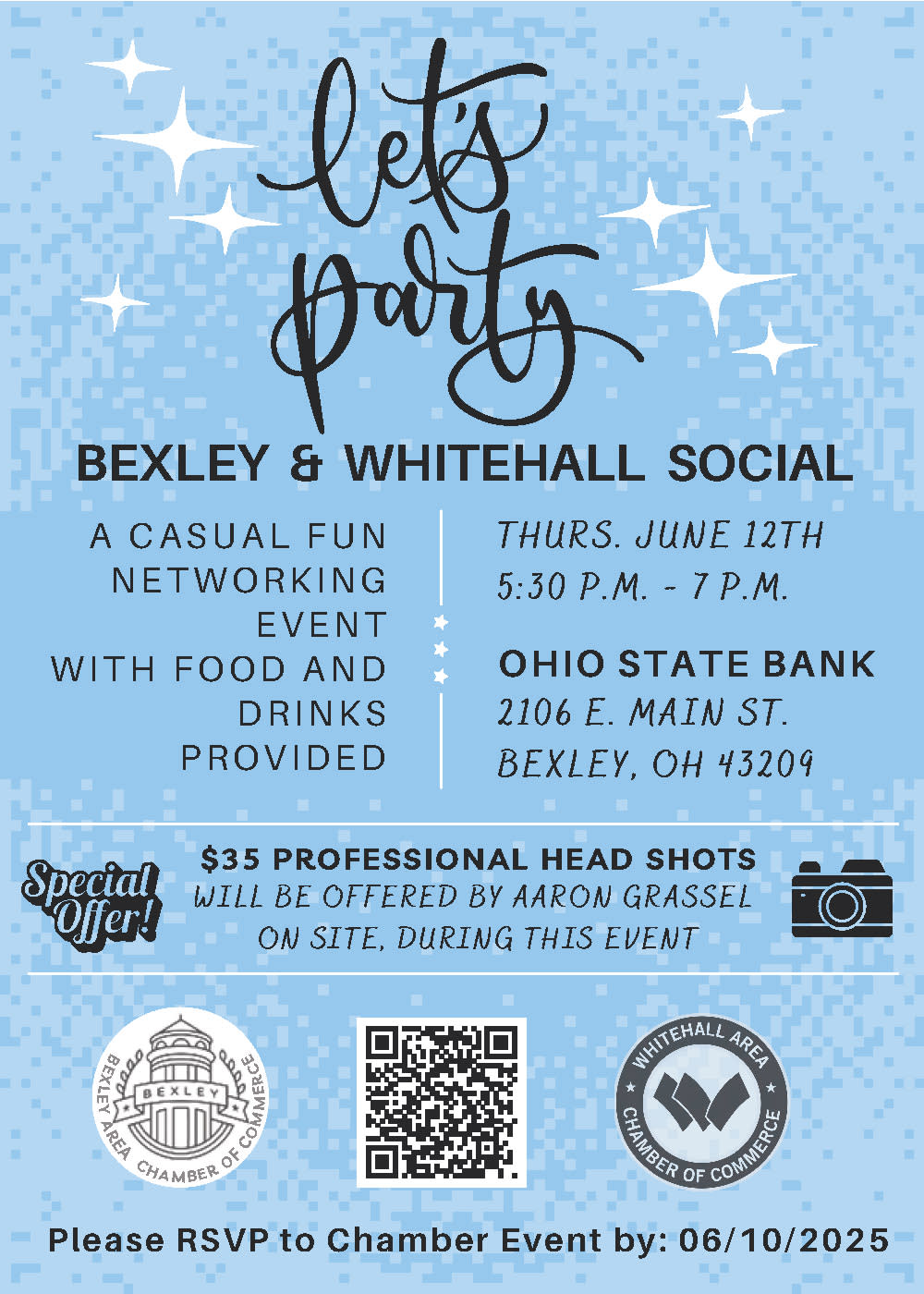 We will have a joint happy hour with the Whitehall Chamber of Commerce. Also, there will be Head Shots available for $35 at the event.
